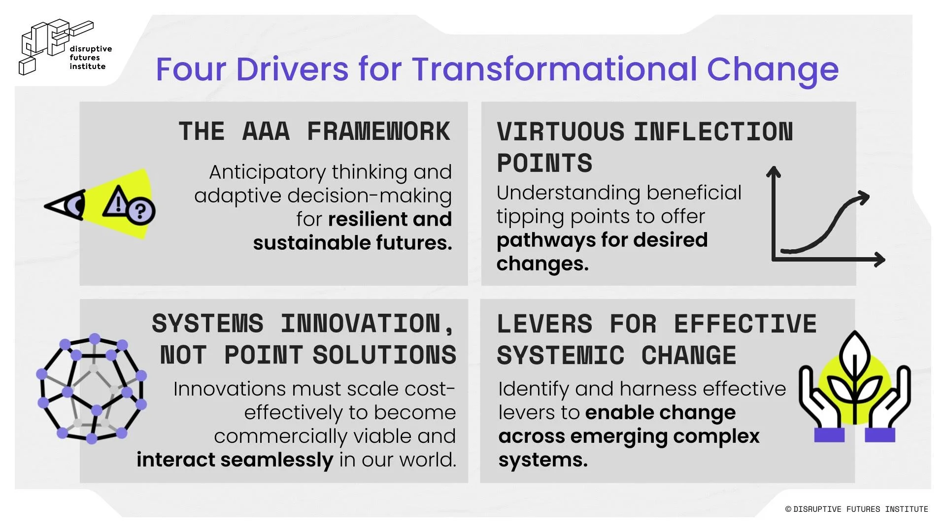 The Disruptive Futures Institute is helping to evolve the language and scope of the futures field, offering a comprehensive set of frameworks, methodologies, tools, language, and core concepts to help individuals and organizations shape resilient, transformative futures.