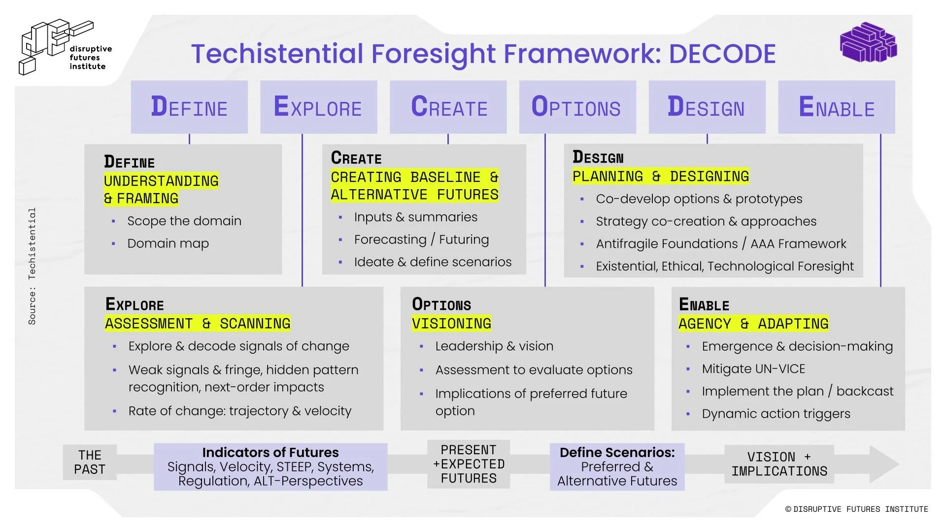 Techistential’s Foresight Framework (DECODE) is designed to help explore signals of change (including weak signals at the fringe, scanning, and emerging issues), uncover patterns, calibrate the dimensions of uncertainty, probability, and risk, and think in different time horizons.